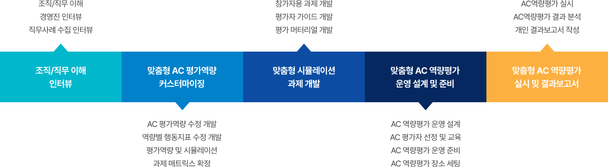 고객사의 요구와 비즈니스 상황에 맞춰 AC 역량평가를 설계한 후에 AC 평가역량과 시뮬레이션 과제를 맞춤형으로 개발하고,