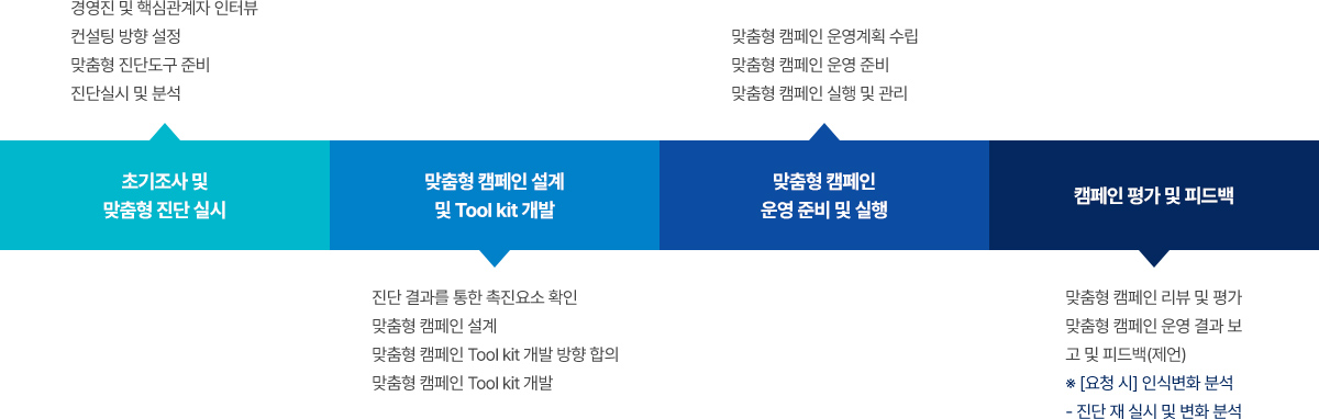 맞춤형 컨설팅은 초기조사 및 맞춤형 진단 실시, 맞춤형 캠페인 설계 및 Tool kit 개발, 맞춤형 캠페인 운영 준비 및 실행, 캠페인 평가 및 피드백 등의 프로세스로 진행합니다.