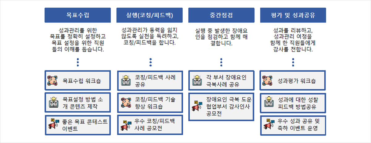 성과관리 내재화 캠페인은 조직 내 성과관리 단계에 맞춰 프로세스를 설계하며, 각 프로세스 별로 직원들의 역량을 높이는 학습자료 제공, 분위기 조성을 위한 공모전,
